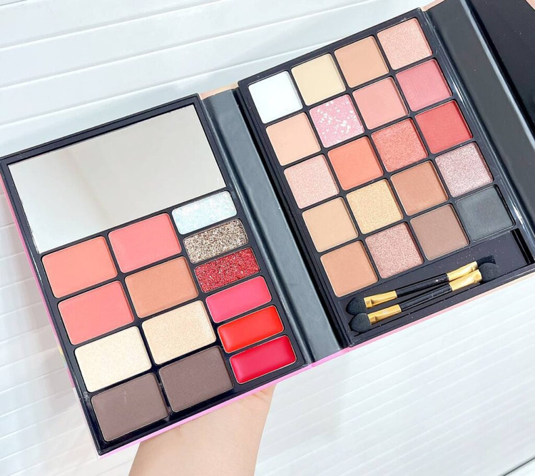 20 رنگ سایه،3رنگ رژ خوش رنگ قرمز، ، گوشتی، صورتی و داره ۲عدد هم پنکک داره و تا ۲ سایه ابرو خوش رنگ ۴ عدد رژگونه و ۳ رنگ سایه ژله ای گلیتری