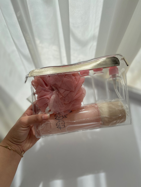 پک شامل: یک عدد لیف سه عدد بطری و یک عدد جای وسایل شخصی(مسواک و خمیر دندون و…) و یه کاور ضد آب